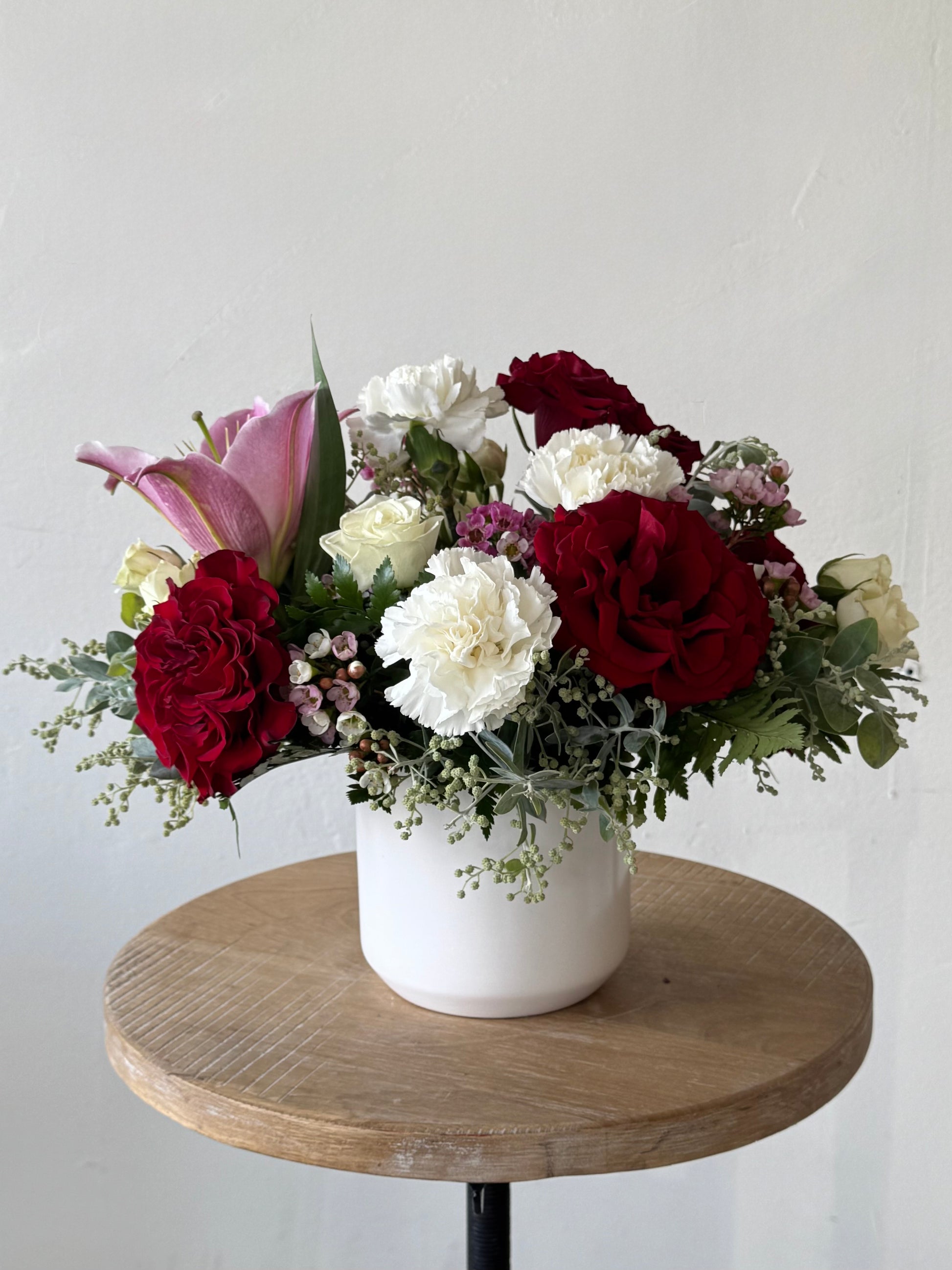 Everlasting Romance is a lush composition of velvety red roses, creamy whites, and gentle blush accents. Textural blooms and fresh greenery spill naturally from a modern white vessel, creating a look that’s both heartfelt and sophisticated—perfect for celebrating love, milestones, or meaningful moments.