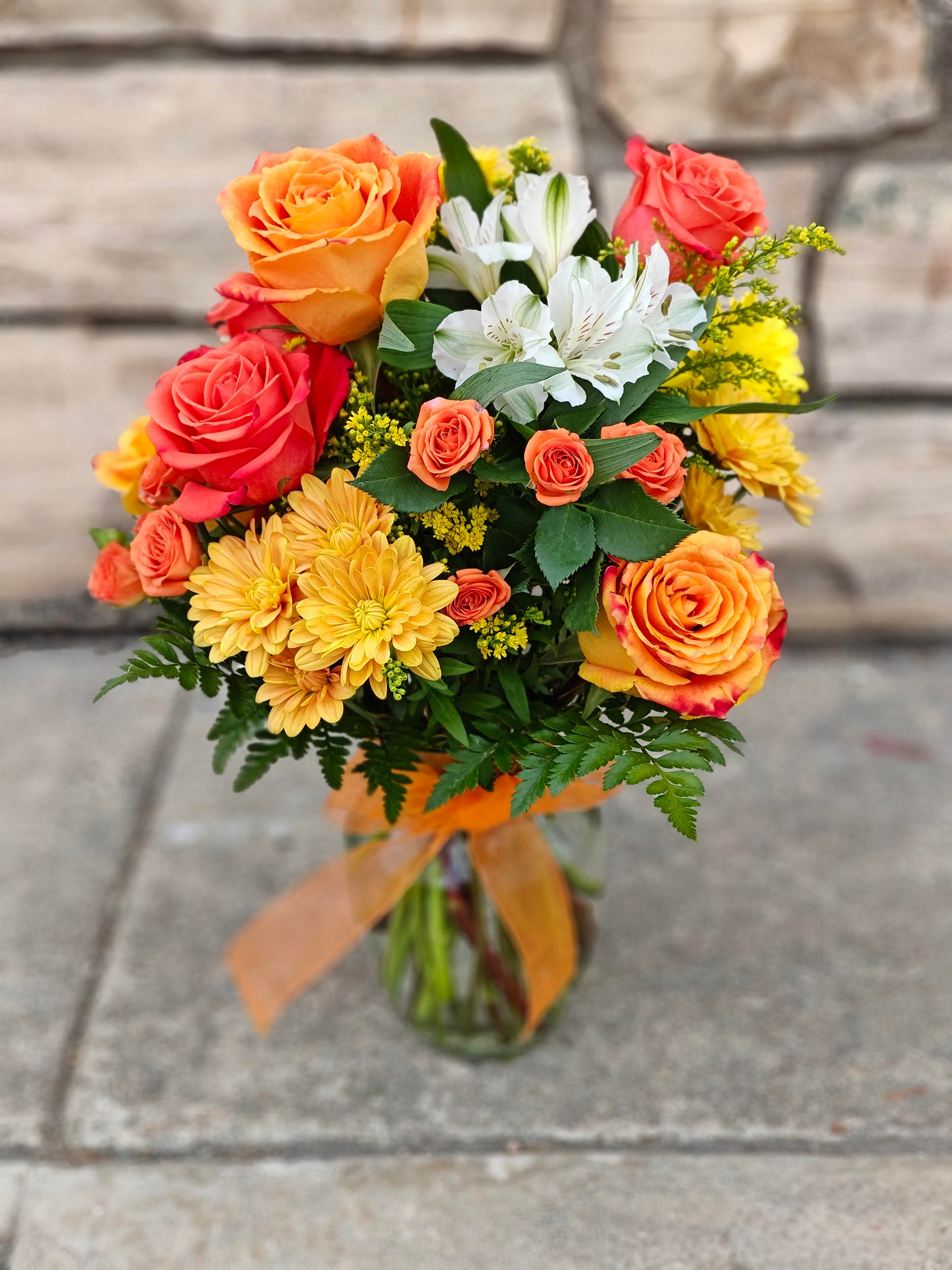 Brighten your day with a burst of color and whimsy! This cheerful bouquet features vibrant orange, playful yellow accents, and elegant greenery for a fresh, uplifting look.