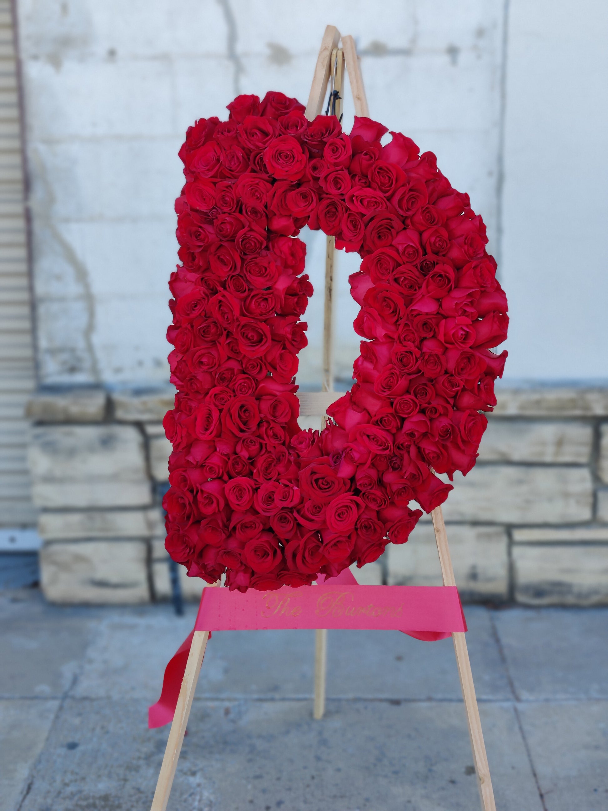 This 30-inch tall Rose Letter is designed with a single letter shape of your choice that is beautifully decorated with over 5 dozen roses. Included with each wreath is an easel and you can request a complimentary ribbon to complete the look. In addition to the popular red hue, we also offer white, yellow, and pink options.