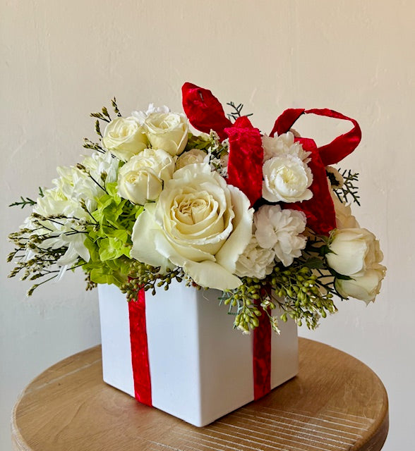 Wrapped in Love features creamy ivory roses and soft white blooms accented with fresh greenery, all presented in a modern white cube tied with a bold crimson ribbon. Designed to resemble a beautifully wrapped present, this arrangement is perfect for heartfelt holiday gifting.