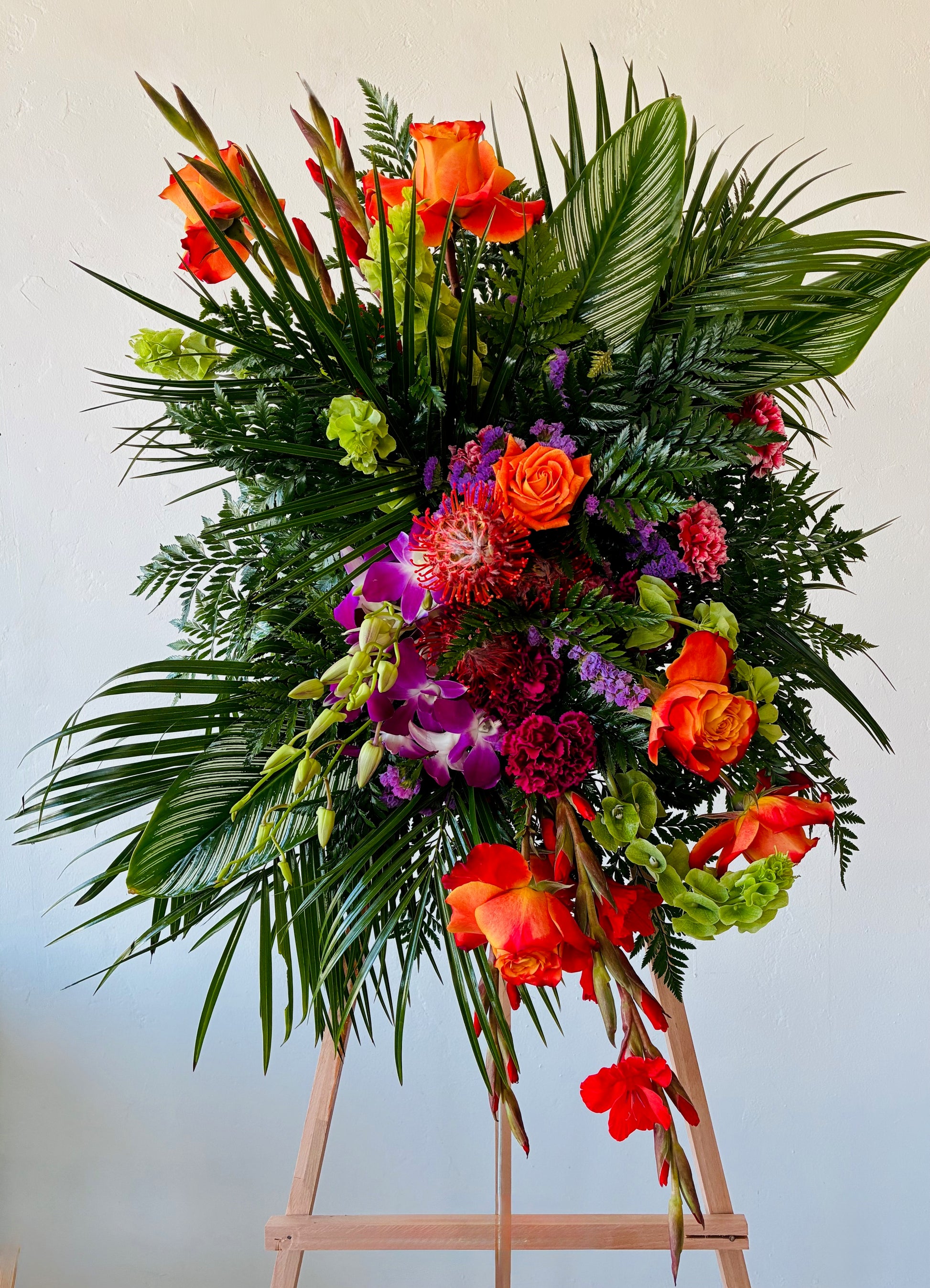 Celebrate the lives of beach and ocean lovers with our Tropical Standing Spray. This elegant arrangement features seasonal tropical flowers and green leaves, a beautiful tribute to their love of the sea. Limited availability adds to the exclusivity of this premium product.